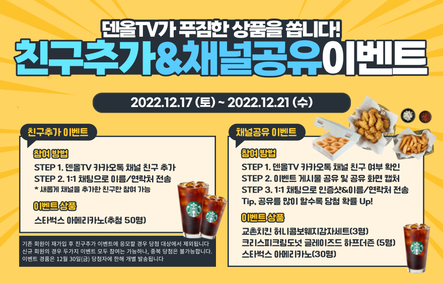 ![]() 덴올TV 카카오톡 채널에서 덴올 소식을 가장 먼저 받아보세요~ ✔치과종사자들을 위한 덴올의 유익한 콘텐츠 정보 ✔덴올TV 프로그램 및 편성표 안내 ✔카카오톡 채널 친구만을 위한 푸짐한 이벤트 혜택 ✔덴올TV 프로그램에 관한 1:1 채팅 문의 + 생방송 알림받고 본방사수부터 실시간 채팅 이벤트 참여하기! 이벤트 기간 : 12월 17일(토) ~ 12월 21일(수) ★ Event 1. 친구추가 이벤트 1. 이벤트 소개 채널 추가한 신규 회원에게 추첨을 통해 스타벅스 기프티콘 증정(추첨 50명) 2. 이벤트 참여방법 (1) 덴올TV 카카오톡 채널 추가 (2) 1:1 채팅으로 [이름/연락처] 전송하면 참여 완료! ※ 기존 회원이 재가입 후 친구추가 이벤트에 응모할 경우 당첨 대상에서 제외됩니다 ★ Event 2. 채널공유 이벤트 1. 이벤트 소개 채널 이벤트 소식 공유한 채널 친구에게 기프티콘 증정 ☞ 1등 교촌치킨 허니콤보웨지감자세트(3명) ☞ 2등 크리스피크림도넛 오리지널 글레이즈드 하프더즌(5명) ☞ 3등 스타벅스 아메리카노(30명) 2. 이벤트 참여방법 (1) 덴올TV 카카오톡 채널 친구 여부 확인 (2) 카카오톡 채널에 올라가 있는 이벤트 게시물을 공유하고 공유한 화면 캡처! Tip, 많이 공유할수록 당첨 확률 UP! (단체방에 공유한 경우 한 번으로 인정) (3) 1:1 채팅으로 공유 인증샷과 [이름/휴대폰번호] 전송하면 참여 완료! ▶덴올TV와 한번에 카카오톡 채널 친구하기◀ https://pf.kakao.com/_FQYxjb ![]() ========================================================================== ※ 이벤트 유의사항 ※ * 이벤트 경품은 당첨자에 한해 12월 30일(금) 개별 발송됩니다. * 신규 회원의 경우 두가지 이벤트 모두 참여는 가능하나, 중복 당첨은 불가능합니다. * 당첨자 선정 시까지 친구 유지는 필수입니다. * 이벤트 응모/추첨과 관련한 내용은 공개하지 않습니다. * 이벤트 참여 시 제출하는 개인정보는 당첨자 선정 및 경품 발송 시에만 활용되며, 이벤트 종료 후 즉시 파기됩니다. |