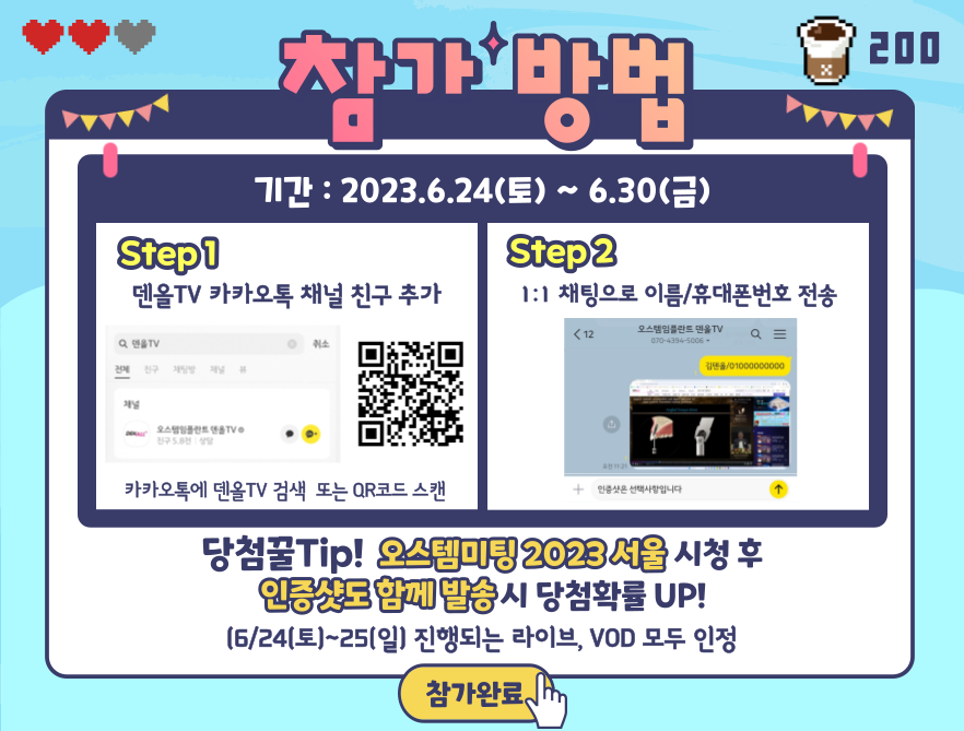 ![]() ![]() ![]() ♬ 덴올TV 카톡 채널 친구하고 아.아 한 잔! ♬ 시원하겄쥬~? 1. 이벤트 소개 덴올TV 카카오톡 채널을 신규로 친구 추가하시는 분들께 스타벅스 커피쿠폰 발송 (추첨 200명) 당첨 꿀TIP >>> 오스템미팅 2023 서울 인증샷도 함께 발송하면 당첨확률 UP ! (6월24일(토)~6월25일(일) 진행되는 라이브, VOD 모두 인정) 2. 이벤트 기간 2023.6.24(토)~2023.6.30(금) 3. 이벤트 참여방법 ① 덴올 카카오톡 채널 친구 추가! https://pf.kakao.com/_FQYxjb ![]() ② 1:1 채팅으로 [이름/휴대폰번호] 전송하면 이벤트 참여 완료! ★당첨 꿀TIP>>>오스템미팅 2023 서울 인증샷도 함께 발송하면 당첨확률 UP ! (6월24일(토)~6월25일(일) 진행되는 라이브, VOD 모두 인정) ★오스템미팅 2023 서울 보러가기 6/24(토)~6.24(일) 라이브 시청 https://www.denall.com/main VOD 시청 https://www.denall.com/category?id=22 4. 쿠폰 지급 당첨자에 한해 7월 14(금) 쿠폰 일괄 발송 ================================================================= ※ 이벤트 유의사항 ※ * 잘못된 개인정보로 인한 경품 발송 오류는 책임지지 않습니다. **기존 회원이 이벤트 기간 내 재응모 할 경우 당첨 대상에서 제외 됩니다. *** 친추추가 및 유지 필수! 카카오톡 채널 추가 후 해제 시 당첨 대상에서 제외됩니다. **** 추첨 결과는 당첨자에 한하여 개별적으로 안내됩니다. ================================================================= |