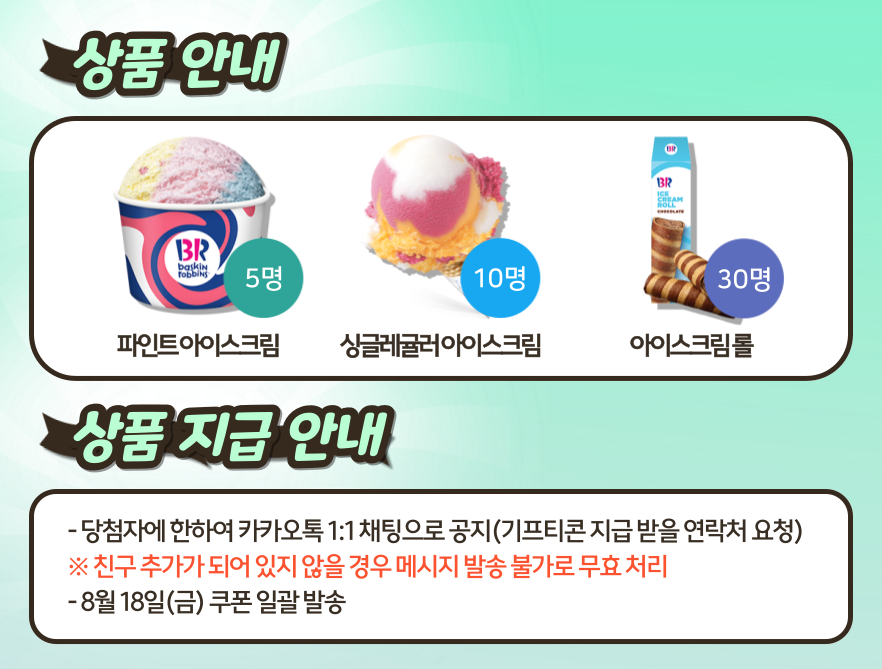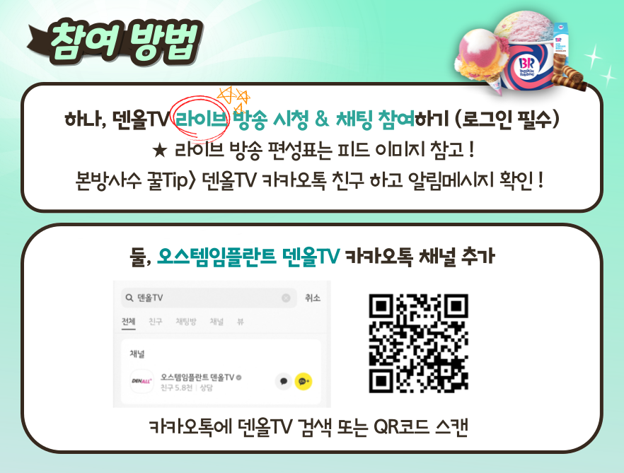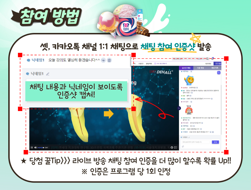 라이브 방송 시청하면 ★시원한 아이스크림★을 쏩니다! ![]() ![]() ![]() ![]() ![]() ![]() 1. 이벤트 소개 이벤트 기간 중 덴올TV 라이브 방송 “채팅” 참여하고 카카오톡 채널로 인증샷을 보내준 회원에게 기프티콘 지급 (차등지급) *당첨꿀TIP >>> 라이브 방송 채팅 참여 인증을 더 많이 할수록 당첨 확률 Up! ※ 인증은 프로그램 당 1회 인정 2. 이벤트 기간 2023.7.3(월)~2023.8.11(금) 3. 이벤트 참여방법 하나, 덴올TV 라이브 방송 시청&채팅 참여하기 ★ 라이브 방송 편성표는 이미지에서 확인 가능 ★ 덴올TV 카카오톡 채널 방송 알림 받으면 더 빠르게 시청 가능! 둘, 오스템임플란트 덴올TV 카카오톡 채널 추가 https://pf.kakao.com/_FQYxjb ![]() 셋, 1:1 채팅으로 채팅 참여 인증샷 발송 ※ 채팅 내용과 닉네임이 보이도록 인증샷 캡처하기 4. 상품 안내 1등 파인트 아이스크림 5명 2등 싱글레귤러 아이스크림 10명 3등 아이스크림 롤 30명 당첨자에 한해 8월 18(금) 쿠폰 일괄 발송 ※ 당첨자에게는 카카오톡 1:1 채팅으로 공지(기프티콘 지급 받을 연락처 요청) ※ 친구 추가가 되어있지 않을 경우 메시지 발송 불가로 무효 처리 ================================================================================== ※ 이벤트 유의사항 ※ *카카오톡 친구추가 및 유지 필수! 친구 삭제 시 당첨 대상에서 제외됩니다. **추첨 결과는 당첨자에 한하여 개별적으로 안내됩니다. ================================================================================== |