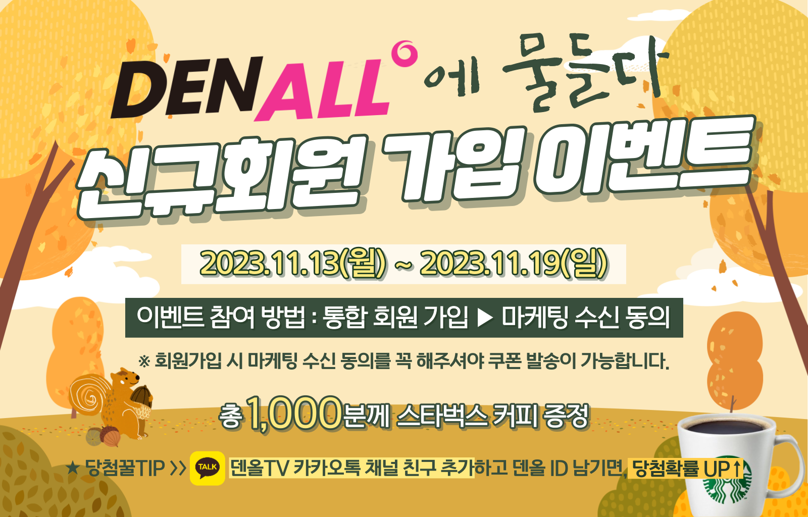 ![]() 가을맞이 DENALL에 물들다~~ 치과전문포털 DENALL이 ♥신규회원 1,000분♥께 스타벅스 커피 기프티콘을 드립니다! 1. 이벤트 소개 가을맞이 신규회원 가입 이벤트 이벤트 기간 동안 신규회원으로 가입해주신 분들께 스타벅스 커피 기프티콘 발송 (추첨 1,000명) 2. 이벤트 기간 2023.11.13(월)~2023.11.19(일) 3. 참여 방법 ① 이벤트 기간 내 덴올 통합회원 가입 (마케팅 수신 동의 필수) ※ 마케팅 수신 동의해주신 회원분들께만 쿠폰 발송이 가능합니다 ※ 당첨꿀TIP >>> 덴올TV 카카오톡 채널 친구 추가하고 덴올 ID 남기면, 당첨확률 UP↑ **덴올TV와 한번에 카카오톡 채널 친구되기 https://pf.kakao.com/_FQYxjb 4. 커피 쿠폰 발송 이벤트 종료 후 12월 1일(금) 쿠폰 일괄 발송 회원 가입하러 가기▶▷▶ ====================================================================== ※ 이벤트 유의사항 ※ - 잘못된 개인정보로 인한 경품 발송 오류는 책임지지 않습니다. - 선착순이 아닌 추첨을 통해 경품을 제공합니다. - 이벤트 응모/추첨과 관련한 내용은 공개하지 않습니다. |
