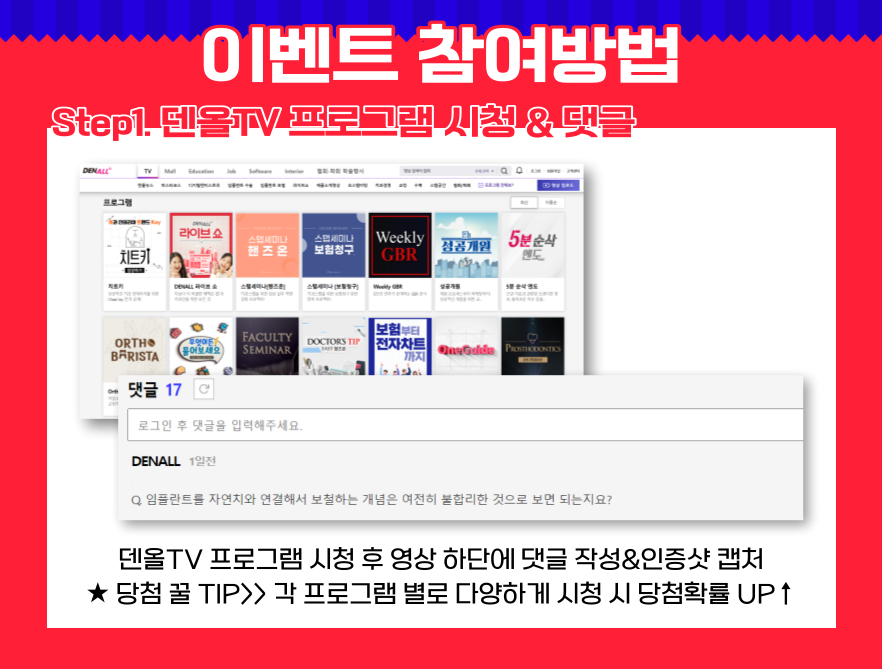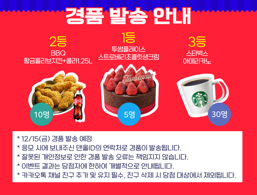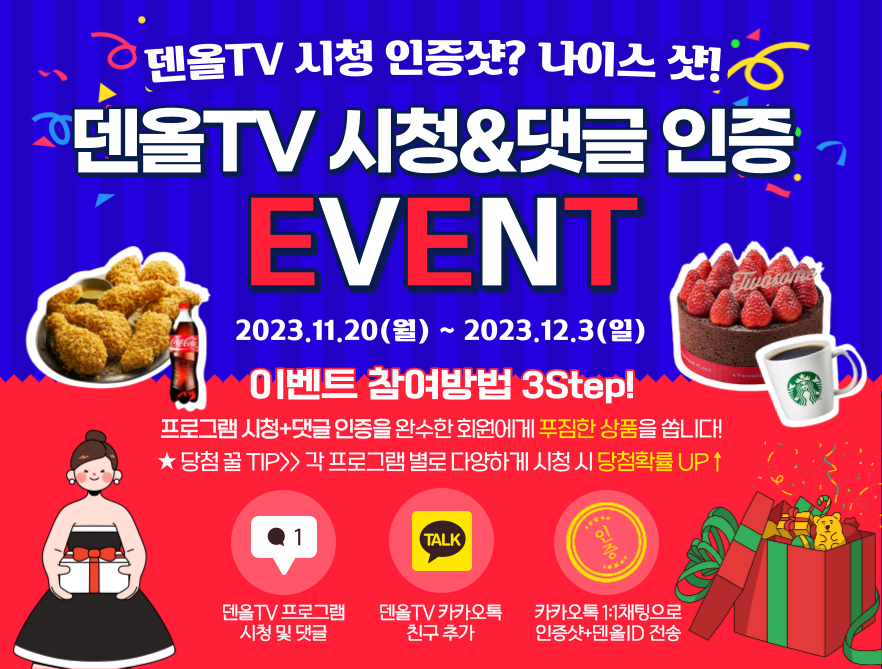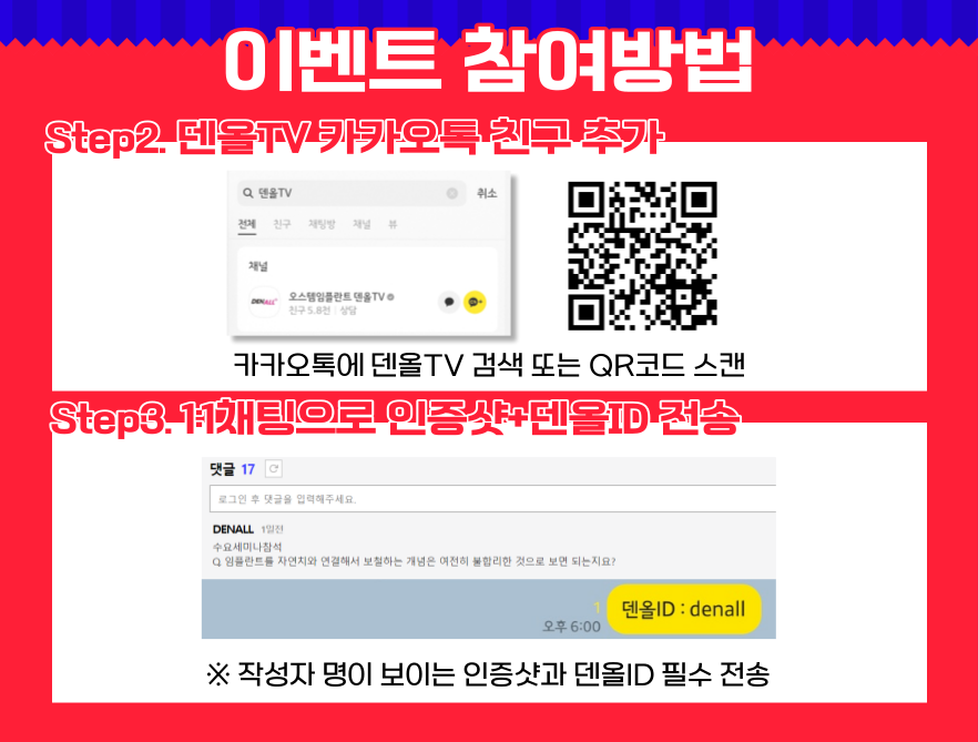 ★푸짐한 상품★을 쏩니다! ![]() ![]() ![]() ![]() 1. 이벤트 소개 ❗ 프로그램 시청&댓글 인증 EVENT ❗ 덴올TV 프로그램 영상 댓글을 남긴 후 카카오톡 채널 1:1채팅으로 인증샷을 보내준 회원에게 기프티콘 지급 (차등지급) 2. 이벤트 기간 2023.11.20(월)~2023.12.3(일) 3. 이벤트 참여방법 하나, 덴올TV 프로그램 시청&댓글 남기기 *당첨꿀TIP >>> 프로그램 별로 다양하게 시청 시 당첨확률 UP! 둘, 오스템임플란트 덴올TV 카카오톡 채널 추가 https://pf.kakao.com/_FQYxjb ![]() 셋, 1:1 채팅으로 인증샷+덴올ID 발송 ※ 작성자 명이 보이는 인증샷과 덴올ID 필수 4. 상품 안내 1등 투썸플레이스 스트로베리초콜릿생크림케이크 5명 2등 BBQ 황금올리브치킨+콜라1.25L 10명 3등 스타벅스 아메리카노 30명 당첨자에 한해 12월 15(금) 쿠폰 발송 예정 ================================================================================== ※ 이벤트 유의사항 ※ * 응모 시에 보내주신 덴올ID의 연락처로 경품이 발송됩니다. * 잘못된 개인정보로 인한 경품 발송 오류는 책임지지 않습니다. * 이벤트 결과는 당첨자에 한하여 개별적으로 안내됩니다. * 카카오톡 채널 친구 추가 및 유지 필수, 친구 삭제 시 당첨 대상에서 제외됩니다. ================================================================================== |
