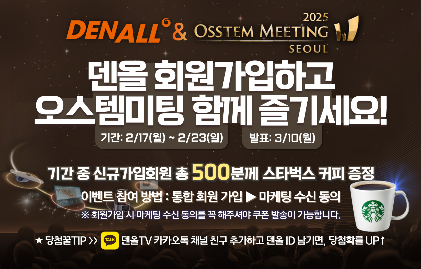 ![]() 오스템 미팅 2025 서울 개최 기념 이벤트 치과전문포털 DENALL이 ♥신규회원 500분♥께 스타벅스 커피 기프티콘을 드립니다 1. 이벤트 소개 덴올 신규회원 가입 이벤트 이벤트 기간 동안 신규회원으로 가입해주신 분들께 스타벅스 커피 기프티콘 발송 (추첨 500명) 2. 이벤트 기간 2025.02.17(월)~2025.02.23(일) 3. 참여방법 이벤트 기간 내 덴올 통합회원 가입 (마케팅 수신 동의 필수) ※ 마케팅 수신 동의해주신 회원분들께만 쿠폰 발송이 가능합니다 ※당첨꿀TIP >>> 덴올TV 카카오톡 채널 친구 추가하고 1:1 채팅으로 덴올 ID 남기면, 당첨확률 UP ↑ **덴올TV와 한번에 카카오톡 채널 친구되기 https://pf.kakao.com/_FQYxjb 4. 커피쿠폰 발송 이벤트 종료 후 3월 10일(월) 쿠폰 일괄 배송 ★☆ 신규 회원가입하기 ====================================================== ※ 이벤트 유의사항 ※ - 잘못된 개인정보로 인한 경품 발송 오류는 책임지지 않습니다. - 선착순이 아닌 추첨을 통해 경품을 제공합니다. - 이벤트 응모/추첨과 관련한 내용은 공개하지 않습니다. ※ 이벤트 참여 동의 안내 ※ *해당 이벤트는 당첨자 선정 및 커피쿠폰 발송을 위한 개인정보 제공에 동의한 것으로 간주합니다. *수집항목: 고객식별번호, 이름, 휴대폰 번호, 주소, 마케팅수신동의여부 *수집목적: 이벤트 조건 달성 여부, 당첨자 안내, 경품 증정 *개인정보 보관 기간: 이벤트 당첨자 발표 후 3개월 보관 *파기 방식: 이벤트 관련 개인정보 파일 완전 삭제 |