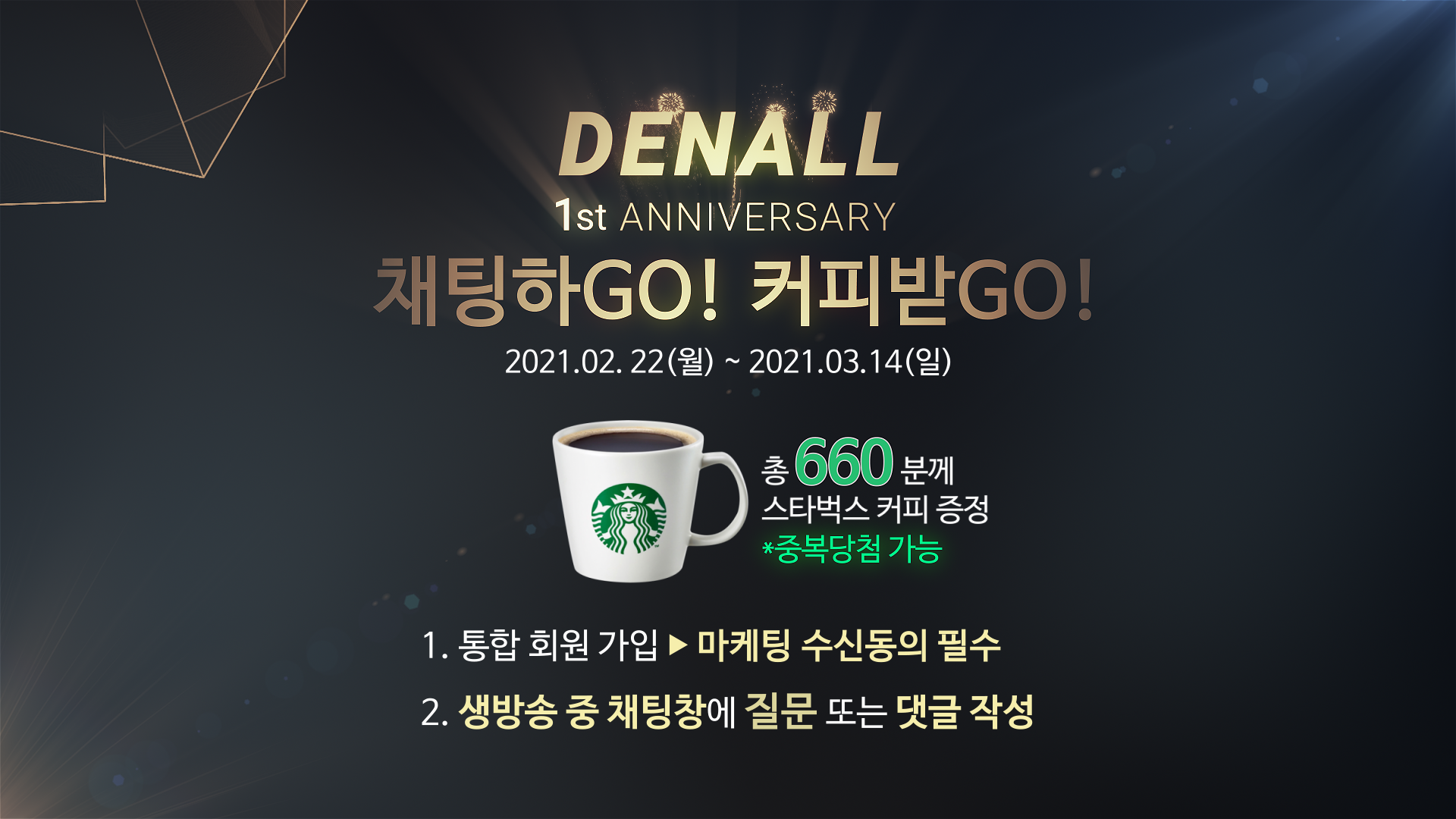 | 이벤트 | DENALL 개국 1주년 ★ 채팅하고GO! 커피받GO! ★ | 등록일 2021.02.19 | 조회수 2948 | 공유하기 | ||