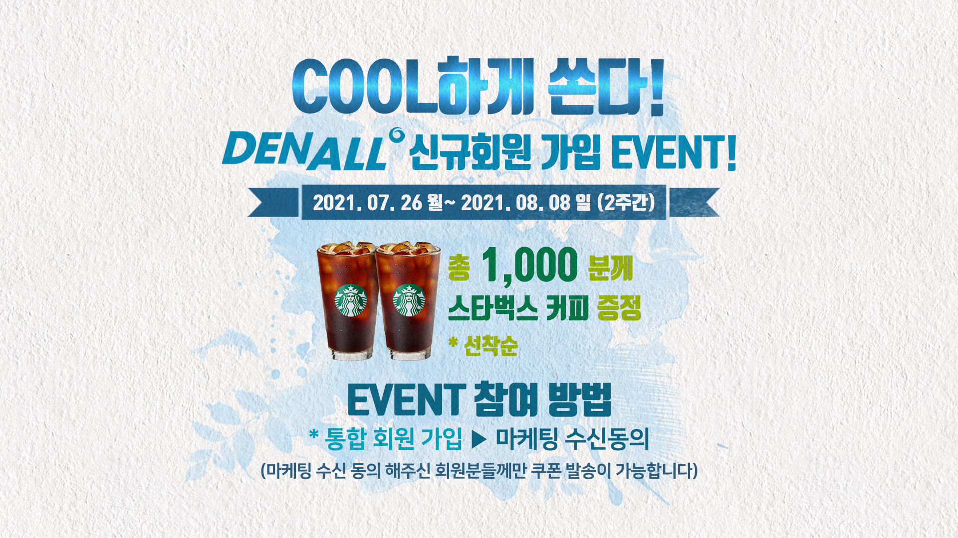 ![]() 치과전문포털 DENALL이 신규회원 1,000분께 커피 기프티콘을 드립니다! 1. 이벤트 기간 2021.07.26 (월) ~ 2021.08.08 (일) 2. 이벤트 소개 휴가가Go 커피먹Go!! 이벤트 기간 동안 신규가입해주신 회원분들께 커피 기프티콘 발송 (총 1,000명) 3. 이벤트 응모방법 ① 이벤트 기간 내 덴올 통합회원 가입 (마케팅 수신 동의 필수) (※ 마케팅 수신 동의해주신 회원분들께만 쿠폰 발송이 가능합니다) 4. 당첨자 발표 및 경품 발송 이벤트 종료 후 08.10(화) 쿠폰 일괄 발송 ------------------------------------------------------------------------------------------------------- ※ 이벤트 유의사항 - 잘못된 개인정보로 인한 경품 발송 오류는 책임지지 않습니다. - 이벤트 응모/추첨과 관련한 내용은 공개하지 않습니다. - 본 이벤트는 당사 사정에 따라 사전고지 없이 임의변경 또는 조기종료 될 수 있습니다. |