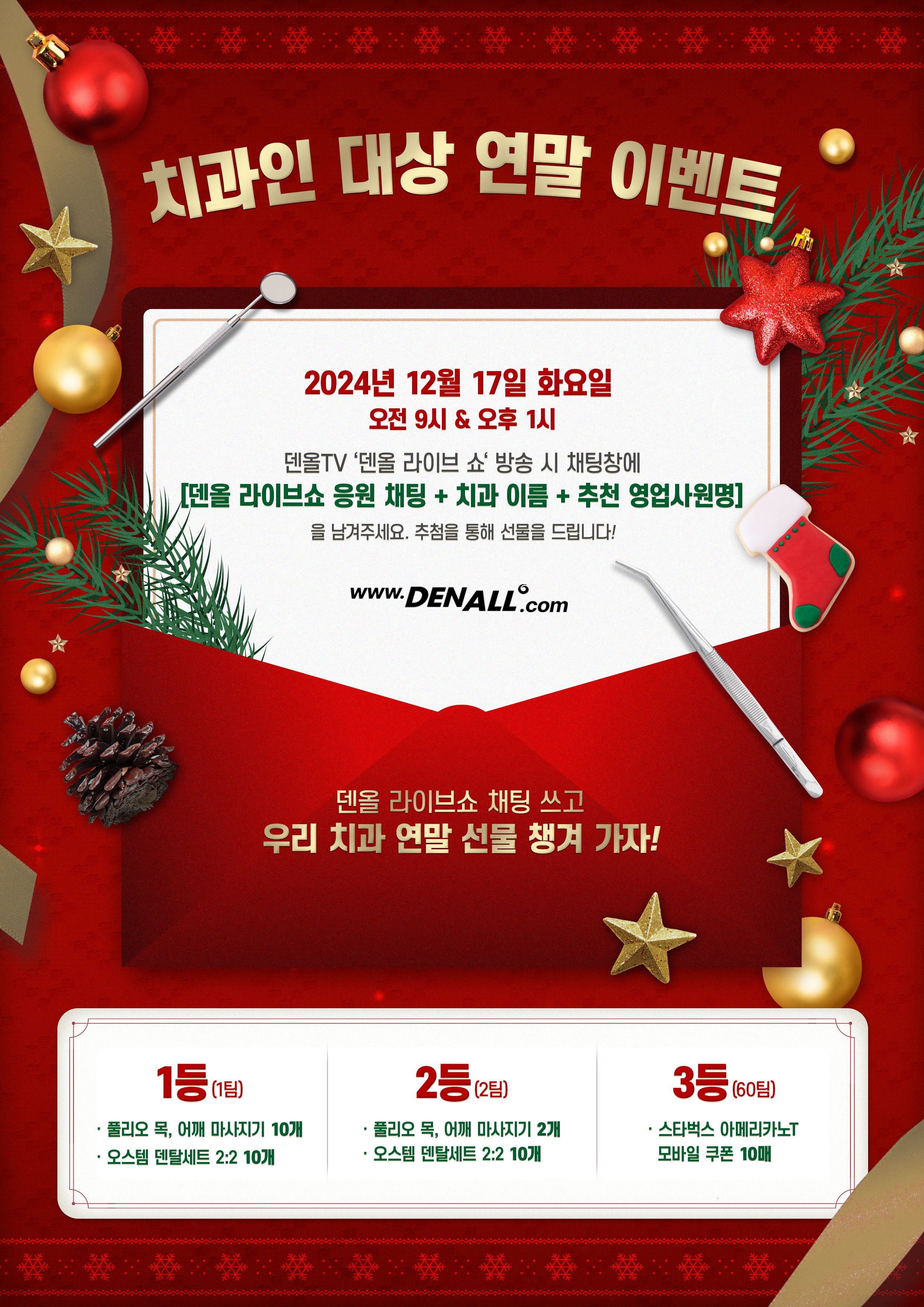 우리 치과 연말 선물 챙겨가세요! 치과인을 위한 쇼핑 채널 ‘덴올 라이브 쇼‘!에서 연말 이벤트를 진행합니다! ♥경품♥ 1등 – 1팀 ·풀리오 목&어깨 마사지기 10개 ·오스템 덴탈세트 2:2(치약2개+칫솔2개 세트) 10개 ![]() 2등 – 2팀 ·풀리오 목&어깨 마사지기 2개 ·오스템 덴탈세트 2:2(치약2개+칫솔2개 세트) 10개 3등 – 60팀 ·스타벅스 아메리카노T 쿠폰 10매 ♥이벤트 일시♥ 2024년 12월 17일 (화) 오전 9시, 오후 1시 ♥이벤트 응모 방법♥ 12월 17일 오전 9시, 오후 1시 진행되는 '덴올 라이브 쇼’ 방송 채팅창에 [덴올 라이브 쇼 응원 채팅 + 근무중인 치과 이름 + 추천해준 영업사원 이름]을 남기면 응모 완료! 추첨을 통해 경품을 드립니다 예시) 덴올 라이브 쇼 화이팅 !! / 마곡 오스템치과 / 홍길동 주임 ▶이벤트를 안내해 준 영업사원이 없다면 미기재 해도 응모 가능! ▶2024년 12월 17일 화요일 오전 9시, 오후 1시 ‘ 덴올 라이브 쇼 - OneMill 5X 특집’ 방송 실시간 채팅에 한 함. ![]() ♥당첨자 발표♥ 2024년 12월 23일 월요일 개별 연락 및 덴올TV 고객센터 ‘공지사항’ 게시판 내 공지 예정 ♥유의사항♥ *덴올 로그인 후 참여 가능하며, 회원구분 덴탈관계자인 회원만 참여 가능합니다. *1등, 2등 실 수령 경품은 근무하시는 치과로 배송되오며, 커피쿠폰은 참여하셨던 계정 정보의 연락처로 모바일 쿠폰이 발송됩니다. *모든 경품은 개인정보제공에 대한 동의를 진행 한 이후 발송 진행됩니다. *각 당첨자는 치과 근무 여부 문의 드리오니 참고 부탁드립니다. *당첨자가 치과관계자가 아닐 시 당첨은 취소됩니다. *여러 회 참여하셔도 ID당 1회 참여만 인정 됩니다. *마케팅수신동의자에 한하여 추첨이 가능하오니, 반드시 마케팅 수신 동의 후 이벤트에 참여하시기 바랍니다. *경품 품절 시 기존 경품 정가에 상응하는 대체품으로 제공 될 수 있습니다. *당첨자 개별 연락 3회 미응답 시 당첨 취소됩니다. *제세공과금 당사 부담 ♥이벤트 참여 동의 안내♥ *해당 이벤트에 응모한 경우 당첨자 선정 및 경품 안내, 경품 배송을 위한 개인정보 제공에 동의한 것으로 간주합니다. *수집항목: 고객식별번호, 이름, 휴대폰 번호, 주소, 마케팅수신동의여부 *수집목적: 이벤트 조건 달성 여부, 당첨자 안내, 경품 증정 *이벤트 경품 발송을 위해 마케팅 대행사에게 개인정보 제공을 진행합니다. (㈜위스탠스) 이에 대한 동의는 당첨자 개별 안내 되오며, 동의 시에만 배송이 가능합니다. *개인정보 보관 기간: 이벤트 당첨자 발표 후 3개월 보관 *파기 방식: 이벤트 관련 개인정보 파일 완전 삭제 ♥많은 참여 부탁드립니다♥ |